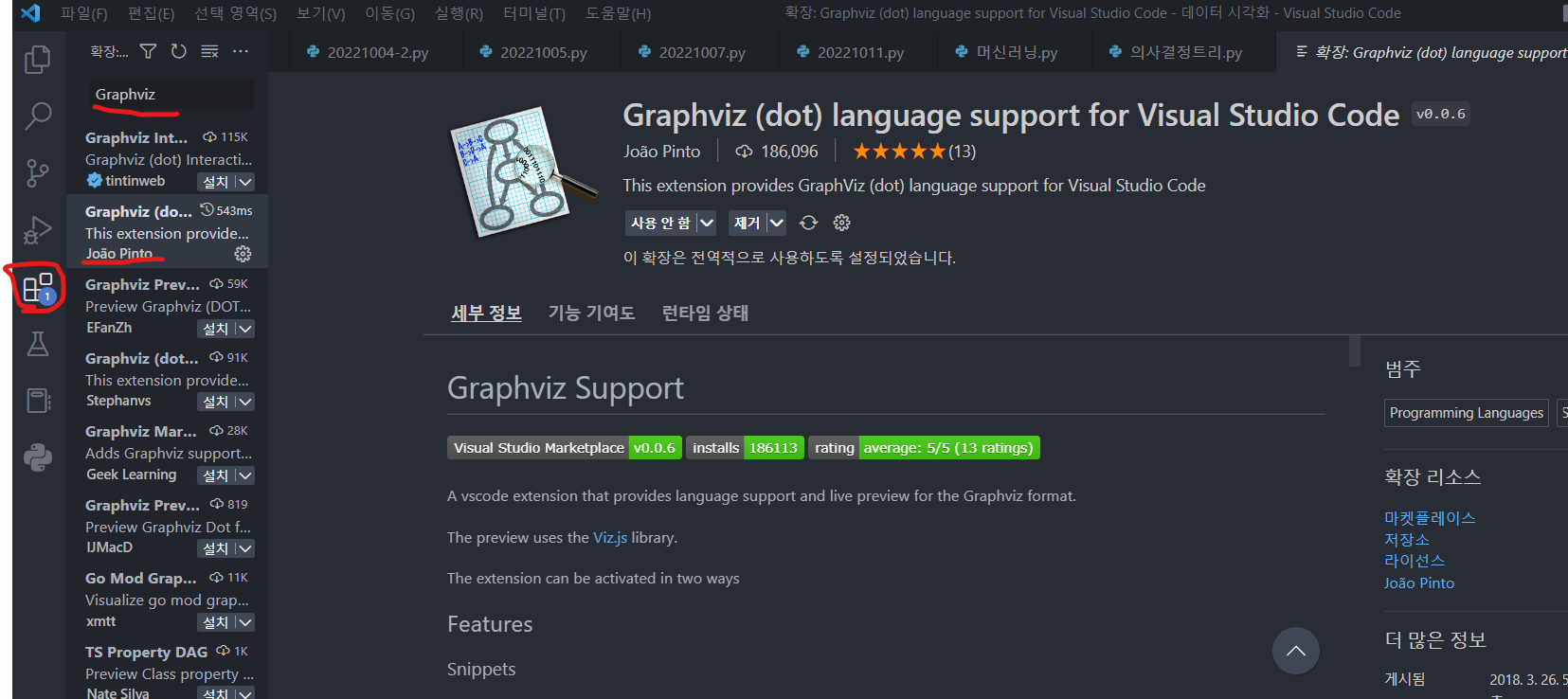 VSCODE 확장탭 > Graphviz 검색 > Joao Pinto 설치